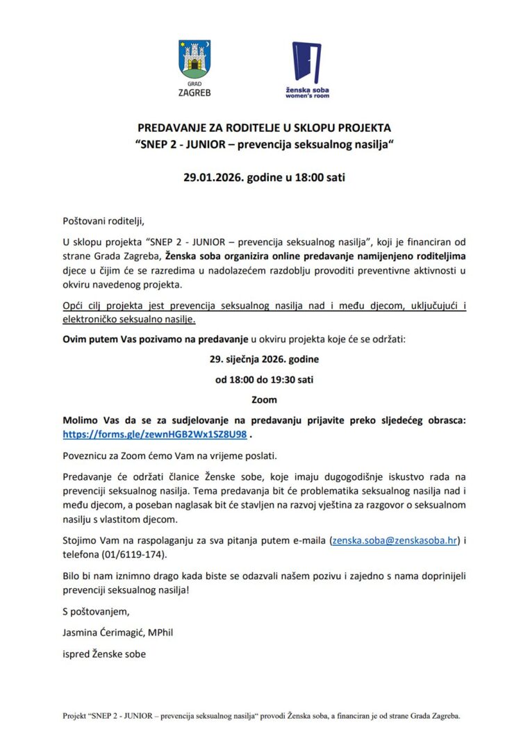 Predavanje za roditelje u sklopu projekta SNEP 2- JUNIOR- prevencija seksualnog nasilja